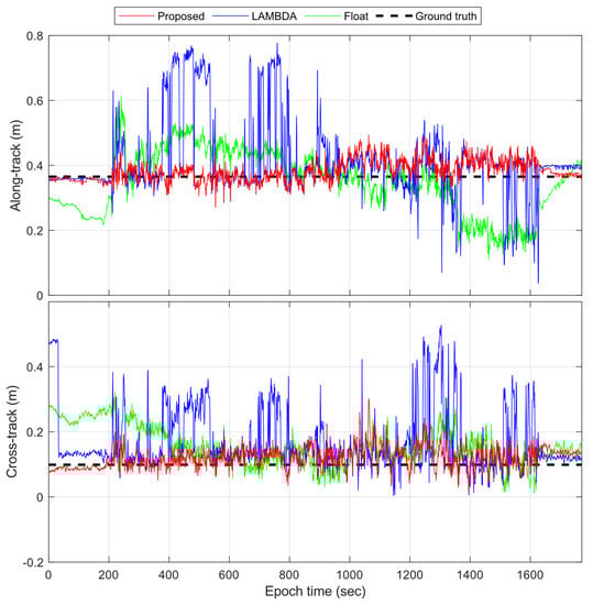 - The proposed method achieves AR to improve the positioning accuracy of smartphones. For the static test, the RMS values are 1.1 cm, 1.7 cm, and 2.1 cm for east, north, and upward directions, in contrast to 0.2 m, 0.2 m, and 0.1 m for the float solutions, respectively. For the kinematic test, the RMS values are 3.8 cm and 3.9 cm for the along-track and the cross-track directions versus 9.8 cm and 8.1 cm for the float solutions.