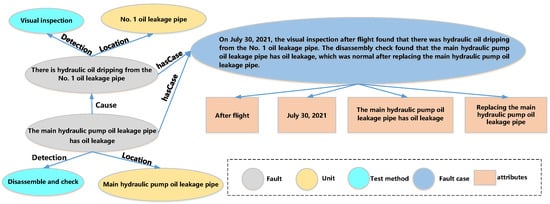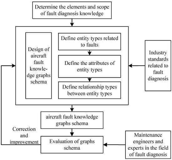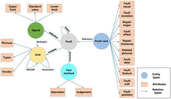 Following the principles mentioned above, we adopted an “evaluation iteration method” to construct the fault knowledge graph schema, as shown in Figure 2. Relying on the evaluation of maintenance personnel and domain experts, the fault knowledge graph schema was continuously iterated and improved until a fault-diagnosis-oriented schema was built, which was unanimously recognized by experts in the field.