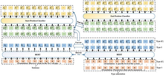 - Fusion of type annotations into sentences. Assume that n is the length of sentence, and m is the length of label annotation. After the process of the BERT network model, is the embedding of the ith token of the sentence for any , and is the embedding of the jth token of the annotation of type c for any . To integrate the information from the label annotations into the sentences, an attention mechanism is employed. The attention score is computed using the following formula,where are learnable parameters of the fully connected layers. Then, the fusion features are obtained viawhere is the hyperbolic tangent function, and and are learnable parameters of the fully connected layers.