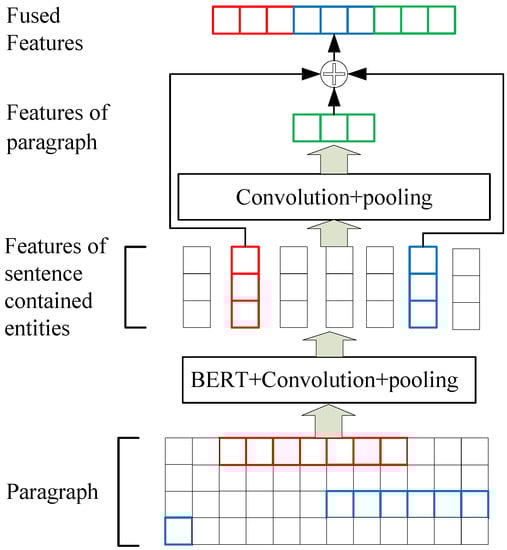 The deep learning method is also employed to extract relationships. This method transforms relationship extraction into a binary classification task, where the model predicts whether a predefined relationship exists between two entities within a particular paragraph. The classifier features were obtained through a multi-step process illustrated in Figure 4. Firstly, the model locates sentences containing entity pairs and extracts their features using the “BERT + Convolution + Pooling” model. The second step involves extracting paragraph-level features through the “Convolution + Pooling” model, which are then concatenated with the sentence features that contain entity pairs to serve as input for the classifier model. To illustrate, let us consider the following example: “…the alarm system continuously reflects that the right engine speed is too high during the descent phase. The reason is that the oil level sensor control component fails, …”. Both of these sentences comprise a fault entity. In this case, the features of the two sentences, along with the paragraph in which they appear, are concatenated, and a classification model is used to determine whether or not a causal relationship exists between the two fault entities.