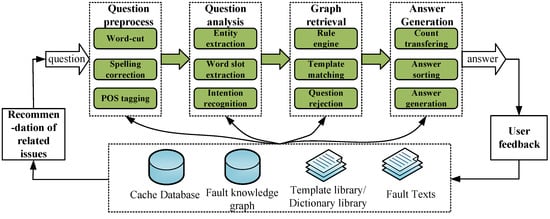 To assist maintenance personnel in effectively identifying the root cause of faults, an intelligent question-answering system was developed using the fault knowledge graph. The system consists of four major modules: a question preprocessing module, a question analysis module, a graph retrieval module, and an answer generation module, as shown in Figure 5.