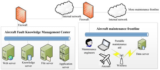 Throughout the life cycle of aircraft, a significant number of documents related to failures are generated [], including FMECA (Failure Mode, Effect, and Criticality Analysis) documents, aircraft maintenance manuals, diagnostic records, and fault analysis reports, among others. These resources provide valuable knowledge for the diagnosis of aircraft faults [,]. However, due to the heterogeneity of the data, these resources exist as fragmented “information islands” [], hindering effective knowledge sharing and leading to inefficient resource utilization. Therefore, in order to achieve comprehensive fault knowledge sharing, it is important to integrate industrial information []. New artificial intelligence methods need to be developed to fully harness this vast textual data of failures, extract and share fault knowledge, and create an “intelligent diagnostic expert by one’s side” for maintenance engineers. The “intelligent diagnostic expert” is designed to provide maintenance engineers with smart diagnostic strategies so that they can accurately and quickly locate faulty units by taking reasonable testing steps.