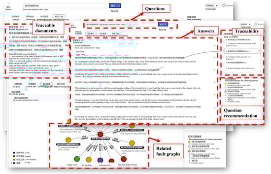 Figure 10 provides a depiction of the interface and an application example of the intelligent question-answering system. The example reveals how the system can assist maintenance engineers encountering abnormal brake pressure failures. An engineer simply inputs the query “How to handle abnormal brake pressure?” into the system, which then identifies various reasons behind the occurrence. Each reason is further accompanied by relevant detection methods. By using these prompts, the maintenance engineer can quickly identify the root cause of the problem. Moreover, the system comes equipped with a knowledge tracing function that allows users to trace the origin of each answer back to its source document. This feature proves especially useful for reference purposes, as maintenance engineers may need to delve further into provided documents to better understand a given issue. Finally, through the use of fuzzy matching, the system is capable of providing similar fault cases or problems that arise in related contexts, enabling maintenance engineers to consider previously solved cases when troubleshooting.