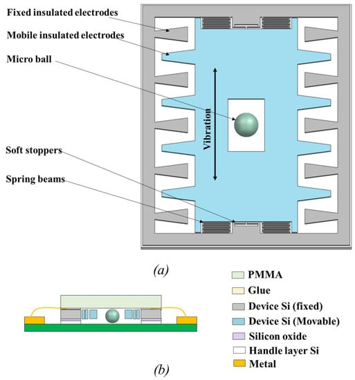 Figure 1a is a simplified schematic of the in-plane gap-closing electrostatic energy harvester investigated here. The device uses relative motion to enable a variation of the capacitance formed between its mobile and fixed electrodes. Under the voltage or charge constraint, this variation of capacitance produces a flow of charge that can be harvested with an appropriate interface electrical circuit to recharge a battery (for the voltage constraint) or increase the potential across a storage capacitor (for the charge constraint) [,,]. The designed device consists of a rectangular shuttle mass suspended by a serpentine spring in each corner. It consists of a rectangular shuttle mass suspended by a serpentine spring in each corner. The movable electrode set (light blue) on the two parallel edges of the shuttle mass is interdigitated with the electrode set (gray) fixed to the substrate, forming a variable capacitor. In the center of the shuttle mass, there is an opening large enough to host a ball of a diameter of order 1 mm, which can move within the cavity in response to the applied external vibration. During vibrations, the distance between the moveable electrodes and the fixed electrodes changes as the shuttle mass travels, causing the capacitance to change. Two sets of soft stoppers (anchored cantilever beams) are placed on each side of the shuttle mass. Their role is to engage with the shuttle mass at a large vibration amplitude and diminish the force experienced when the electrodes collide. A cross-section view of the device is shown in Figure 1b, detailing the materials used in each layer of the device.