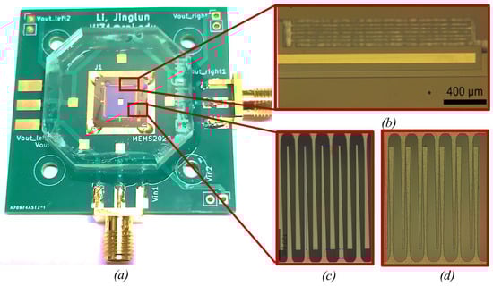 Photographs of the e-VEH: (a) The device mounted on a PCB. Close-up images of the structures: (b) the suspension spring and the trapezoidal electrodes at (c) minimum and (d) maximum capacitance positions. ©[2023] IEEE.