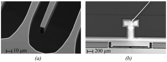 The e-VEH was fabricated using the silicon-on-insulator (SOI) process at MEMSCAP. Inc. (Durham, NC, USA), following the foundry’s design guidelines detailed in []. While the SOIMUMPs process at MEMSCAP used to manufacture these devices greatly restricts device power because of strict limitations on the device size and geometry, it was preferred over custom fabrication due to its high yield. Despite the low power output, MEMSCAP-fabricated devices can still be used for the proof of concept of the proposed approach and investigating ball effects. Furthermore, the performance of the device may be qualitatively compared to a device with a similar size, as previously reported in the literature [,].