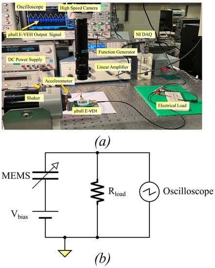 The input port of e-VEH was connected to a DC bias voltage supply (Agilent E3631A), whereas the output port was connected to a load resistor used for electrical characterization, such as voltage and power. A NI Data Acquisition (NI-9215) system connected to LabVIEW software was used to measure the root mean square (RMS) output voltage across the load resistor, and the mechanical excitation’s acceleration amplitude and frequency. The voltage across the resistor was also observed using an oscilloscope (Keysight InfiniiVision DSOX2004A) for viewing the signal and capturing the free oscillations triggered by impact. The circuit shown in Figure 4b was used to measure the output voltage across the series resistance Rload during mechanical oscillations. The internal load resistance of the oscilloscope was 1 MΩ, which means the load was dominated by the measurement apparatus and not by the 72 MΩ resistor.