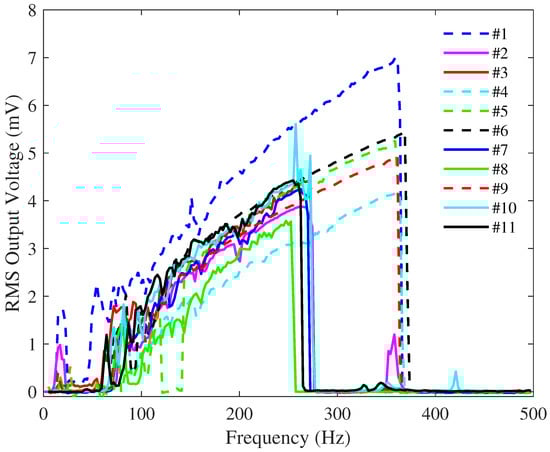RMS voltage output vs. frequency of applied vibration for all 11 devices without visible defects. In all tests, the vibration peak-to-peak amplitude was 1 g, the bias DC voltage was 3 V, and the resistance was 72 M.