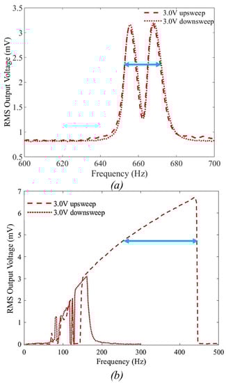 Figure 6 shows a comparison of the measured RMS output voltage between the device under consideration with a die size of 11.15 mm × 11.15 mm and another device from [] with a similar size (11 mm × 11 mm), with similar device thicknesses, and made using the MEMSCAP SOIMUMPs fabrication process. The range of frequencies where the power is 0.707 of the peak power is known as the half-power or 3-dB bandwidth, indicated by a blue arrow. This figure compares the two techniques to broaden the bandwidth: Figure 6a utilizes a parallel system with two similar devices, while Figure 6b employs frequency upconversion with a single device. The measurement is performed without a ball under 1 g peak-to-peak acceleration, 3 V bias voltage, and different ranges for input vibration frequency centered around each device’s natural frequency. As can be seen, this new device design featuring non-uniform cross-section electrodes (Figure 6b) exhibits seven times the bandwidth over the parallel device system (Figure 6a). However, the strong non-linearity due to the electrodes’ shape results in a hysteresis, which only appears at higher voltages and acceleration testing conditions for the parallel device system, where the interdigitated electrodes have a uniform gap [].