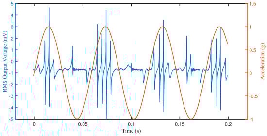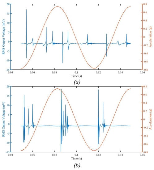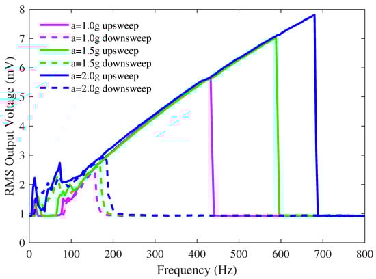 Figure 7 also shows that there is an increase in the device’s RMS output voltage and frequency response range with an increasing acceleration amplitude, as previously reported []. Bandwidth broadening and sweep direction hysteresis with jump-up and jump-down phenomena manifest if a threshold acceleration is exceeded. These characteristics are due to spring hardening, where the peak response is at a frequency below the natural resonance of the microstructure and the frequency response curve is slanted towards higher frequencies.
