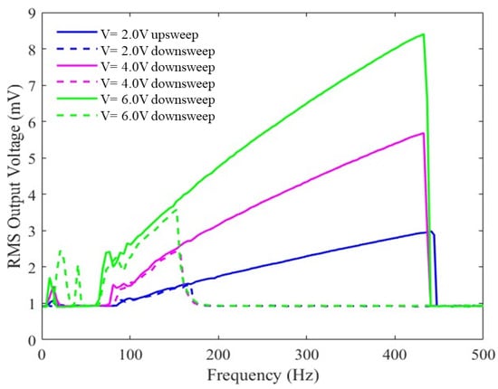 Figure 8 displays a frequency sweep example for device no. 1, showing the RMS output voltage for upsweeps and downsweeps at three different bias voltages (2 V, 4 V, and 6 V) with an input peak-to-peak acceleration of 1 g. For this scenario, the output voltage increases almost linearly with a larger bias voltage; however, the frequency response of the device is not affected much by varying the bias voltage. The hysteresis is still present for similar reasons as mentioned before.