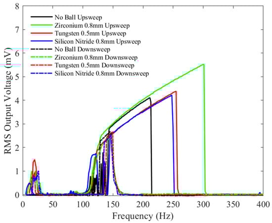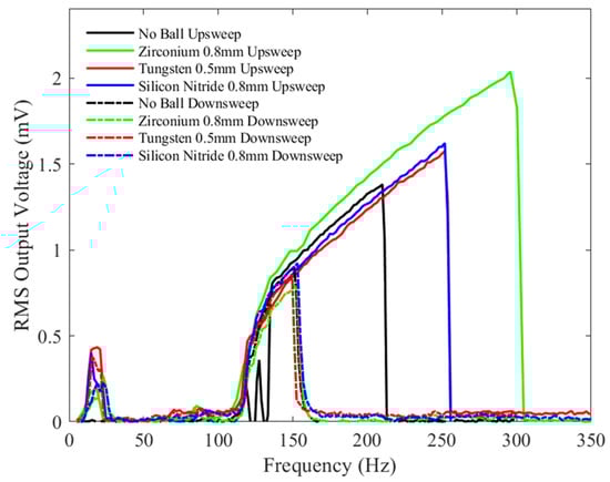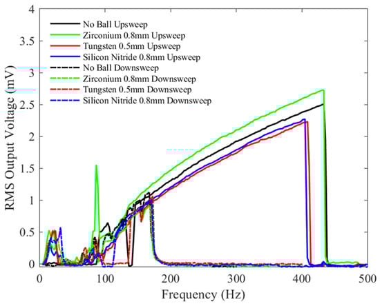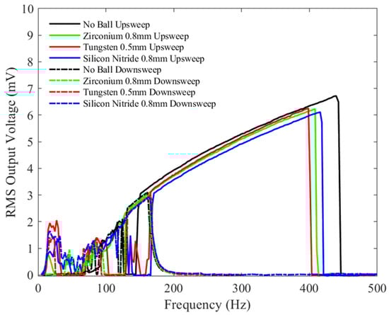 Figure 11 shows the graph of the RMS output voltage as a function of frequency (upsweep and downsweep) with a constant bias voltage of 1.5 V and a peak-to-peak acceleration amplitude of 0.5 g for mechanical vibration. Inspecting the bandwidth, for the upsweep frequency tests, the bandwidth of the device without a microball (black) is lower compared to when the microballs are added. The 0.8 mm zirconium dioxide ball showed the highest device response bandwidth (green), which is more than double that in the case when there is no ball. The Tungsten (red) and silicon nitride (blue) balls show similar responses. It can be concluded that a possible explanation for this increase is that the collisions of the heavier zirconium dioxide ball with the shuttle mass result in the impact of the shuttle mass with the soft stoppers and electrodes, thus changing the effective spring constant of the device, as discussed in []. The short bandwidth of the device without a ball may be explained by the absence of a collision with the end stoppers and the electrodes at the low excitation peak-to-peak acceleration.