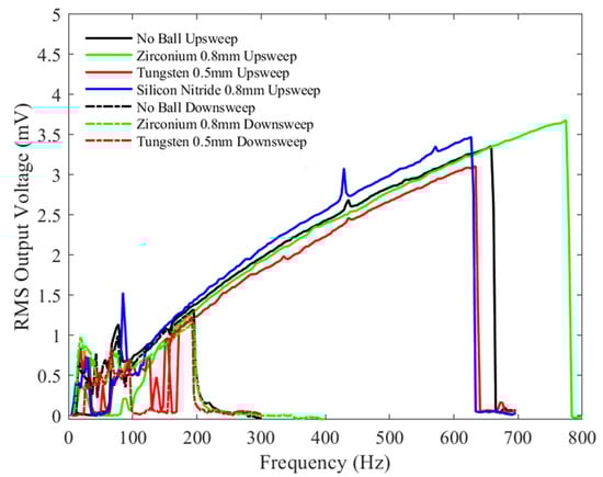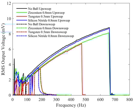 The results shown in Figure 11, Figure 12, Figure 13, Figure 14, Figure 15 and Figure 16 illustrate the RMS output voltage as a function of frequency for upsweep and downsweep scans with and without a microball placed inside the cavity with different peak-to-peak acceleration levels and bias voltages.