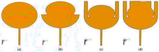 Design procedure of the proposed Antenna 1 (a) step 1, (b) step 2, (c) step 3, (d) step 4.