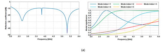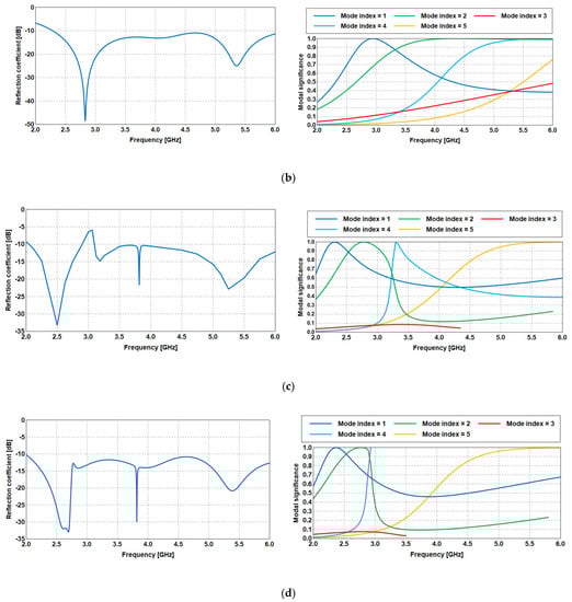 The proposed Antenna 1 is designed in four steps, as seen in Figure 2a–d. Different parasitic patches are integrated with the main radiator to improve its performance. The simulation process using CMA includes only the radiating patch as a perfect electrical conductor (PEC) without the substrate, ground, and excitation. The modal significance (MS) parameter, which ranges between 0 < MS ≤ 1 is observed in CMA simulations. Modes with values of MS greater than 0.707 are active modes and have high potential to be excited using the specific structure shown in Figure 2. Then, the MS results in each step of design are compared with the reflection coefficient of the complete antenna (with substrate, ground, and excitation) based on the normal method of moments (MoM) (see Figure 3a–d). The simulation process using CMA provides the natural resonance of the modes, which can help in understanding the antenna operation and estimating the antenna bandwidth based on physical insights from MS in less time.