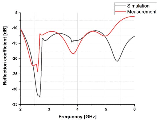 This section presents the results and analysis of the proposed wideband antenna in free space in terms of reflection coefficient, radiation patterns, surface current distributions, efficiency, and gain. First, Figure 5 shows the simulated and measured reflection coefficient of the antenna on the Kapton polyimide film substrate. Simulations showed that the proposed antenna spans a frequency band larger than 4 GHz with an operational range from 2 to 6 GHz, with satisfactory impedance matching. The reflection coefficient reaches a minimum value of −32.21 dB at roughly 2.7 GHz. On the other hand, the measured reflection coefficient indicates that the antenna has a very good impedance matching with a reflection coefficient below −10 dB from 2 to 5.27 GHz. This shows that the antenna has a bandwidth larger than 3.2 GHz.