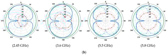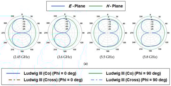 Figure 6a,b illustrates the simulated polar radiation patterns and the co- and cross-polarization of the proposed antenna, respectively. The far-field patterns over a range of frequencies indicate that the antenna featured a quasi-omnidirectional pattern in the major H-plane (θ = 90°), while a bidirectional radiation pattern is found for the E-plane (θ = 0°). As the frequency increases, the lower half of the pattern shows a significant distortion with more ripples. Additionally, it is found that the radiation is reduced from the non-radiating edges that are responsible for cross-polarized radiation, which is mainly caused by the currents on the feeding probes. The designed antenna exhibits a peak gain of 8 dBi at 3.6 GHz, 5 dBi at 2.45 GHz, and 4 dBi at 5.5 GHz and 5.8 GHz, respectively.