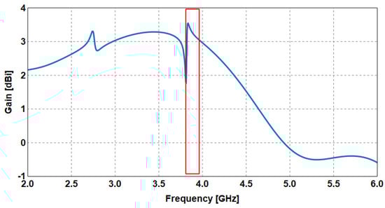 - Finally, the radiating patch is integrated with the substrate and excitation to form the complete antenna. Analysis indicated that the maximum gain of 3.54 dBi is achieved at 3.83 GHz, as indicated in the red box in Figure 9. Note that the frequency at which a maximum electric field was achieved based on the EMC-based CMA method agrees closely with the frequency of the maximum gain of the overall antenna.Figure 9. Gain of the wideband antenna.