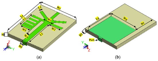 Configuration of Antenna 2 from [] (a) Front view, (b) Back view. Ls = 42 mm, Ws = 32 mm, L1 = 15.3 mm, L2 = 26.625 mm, L3 = 2.25 mm, W1 = 8.97 mm, W2 = 11.625 mm, W3 = 9 mm, W4 = 2.625 mm, Wf = 3.75 mm, h = 3 mm, Lg = 24 mm, Wg = 25 mm, D1 = 18 mm, and D2 = 3.5 mm.