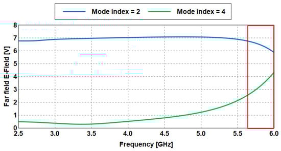 The steps to calculate the EMC values of Antenna 1 is then applied to Antenna 2 to further validate the proposed method. Only its radiator is first analyzed using CMA. Figure 11 shows the electric field of modes 2 and 4, which are then combined, as seen in Figure 12. From the results obtained in Table 2, it is observed that the four maximum values of the EMC of 10.22, 9.99, 9.72, and 9.46 V are achieved at 6, 5.9, 5.8, and 5.7 GHz, respectively, as also indicates in the red box in Figure 11.