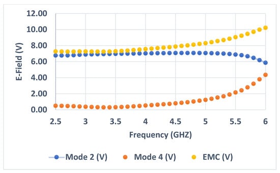 - Next, these two modes are then combined to form a wide specific band (from 2 to 6 GHz) as represented in Equation (1). For example, at 3.7 GHz, the electric field of mode 2 is 5.79 V, whereas it is 6.62 V at mode 4. Then, the EMC method is applied as follows: