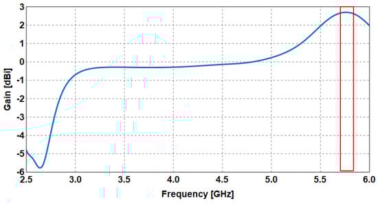 The gains produced from the overall antenna indicate that the maximum gain is achieved at 5.77 GHz, as illustrated in the red box in Figure 13. This also agrees with the frequency where the maximum gain is obtained using the EMC-based CMA method.