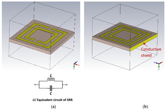 (a) Conventional complementary (C-SRR) unit-cell and its simplified equivalent circuit model, and (b) modified unit-cell (M-SRR) with field containment shield.