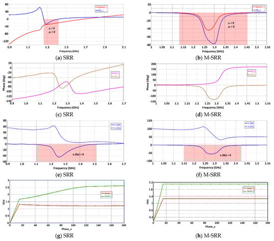 The proposed SRR unit-cell, shown in Figure 2b, has a conductive shield on non-periodic sides to prevent the leakage of the electric field. The characteristics of the SRR unit-cell and the modified SRR unit-cell (M-SRR) are shown in Figure 3. The SRR unit-cell exhibits a negative permittivity and permeability between 1.26 GHz and 1.42 GHz, and the M-SRR has negative permittivity and permeability between 1.13 GHz and 1.46 GHz. As evident in Figure 3a,b, the bandwidth of the M-SRR is more than twice the conventional complementary SRR. The S-parameters of the SRR in Figure 3c show the direction of phase change in the transmission coefficient (S21), which occurs between 1.18 GHz and 1.3 GHz. In the case of the M-SRR, the direction of phase change in S21 occurs between 1.15 GHz and 1.28 GHz. The refractive index (n) of the SRR is negative between 1.1 GHz and 1.51 GHz, and in the case of the M-SRR the refractive index is negative between 1.15 GHz and 1.43 GHz. Figure 3g,h shows how the phase of the first two modes changes with frequency with periodicity in the x-direction for the SRR unit-cell and the M-SRR unit-cell. For the complementary C-SRR, mode 2 is dominant at frequencies above 1.3 GHz up to 2.6 GHz, and the phase varies in a non-linear fashion. However, in the case of the M-SRR, mode 2 is dominant above 1.25 GHz and up to 2.1 GHz. Furthermore, above a phase of 15 degrees, the phase remains static for both modes. It is evident from these results that the modified SRR extends the metamaterial properties of negative permittivity and permeability by a factor of two.