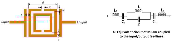 The modified SRR is coupled with the input/output ports with a T-shaped feedline, as shown in Figure 4. In Figure 4, the equivalent circuit of the proposed M-SRR unit-cell is represented as a parallel LC circuit which is connected in series with an LfCc circuit that represents the coupled input/output feedlines. The total impedance (ZT1) of this structure is given by: