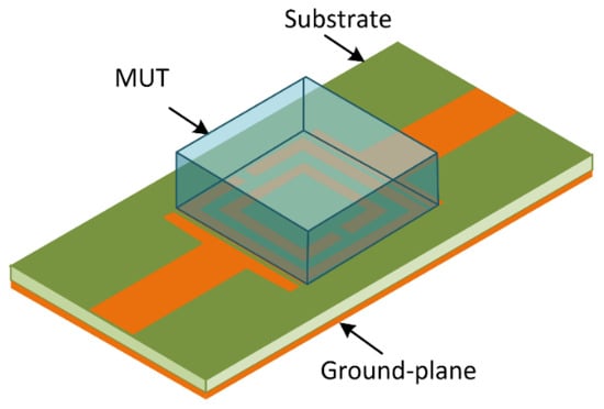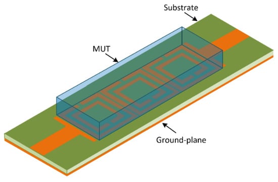 Sensitivity analysis was carried out for the proposed M-SRR sensor. This involved locating the sample of the material under test (MUT) of a finite dimension, permittivity and loss tangent on top of the unit-cell sensor, as shown in Figure 6. The sample does not cover the input/output feedlines but only the unit-cell sensor to effectively perturb its E-field. The resonant frequencies of the sensor will vary when the MUT is placed on the sensor. This is because the sensor’s E-field penetrates the MUT. The variations of the resonant frequencies can be expressed in terms of the effective permittivities, as given by: