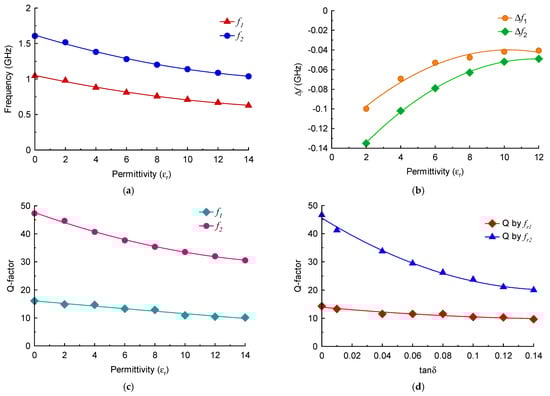 The quality (Q) factor of a resonator Is given by , where fr is the resonant frequency, and ∆f is the 3 dB bandwidth. The Q-factor of the first resonance mode is significantly lower than the second mode, as is evident in Figure 7c. Compared to the second mode, the Q-factor of the first mode declines marginally in a linear fashion with an increase in MUT permittivity. Figure 7d shows how the Q-factor of both modes is affected by increasing the loss-tangent (tan δ) of the MUT. There is a negligible effect on the Q-factor of the first mode; however, the Q-factor of the second resonance deteriorates rapidly with increase in the loss-tangent. This indicates that the second mode is particularly sensitive to dielectric loss of the MUT.