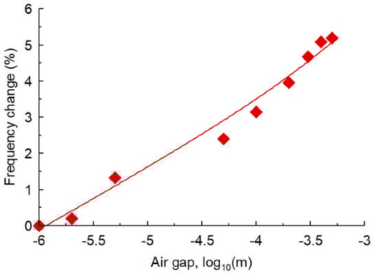 Since the sensor is flat and the sample is a rectangular block with a flat bottom, there is a negligible possibility of having an air gap between them which would otherwise underestimate the permittivity of the MUT. The presence of an air gap will alter the resonator’s load, which will consequently introduce errors in the permittivity measurement. To determine the degree of error introduced by an air gap, it was necessary to conduct a study. Figure 8 shows the percentage change in the resonance frequency of the first mode by the air gap between the sensor and the MUT sample. The results are for an MUT sample with a permittivity of 2 and tan δ of 0.014. The percentage error in the resonant frequency is less than 0.01% for an air gap of less than 2 microns. The graph shows the error increases to 1% with an air gap of 4.6 microns. For an air gap of 15 microns the error is 2%. The trajectory of the error curve stabilizes at 5% for air gaps bigger than 400 microns.