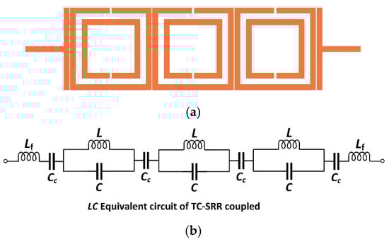 (a) Sensor based on the tri-composite split-ring resonator (TC-SRR). (b) Simplified equivalent circuit model of TC-SRR.