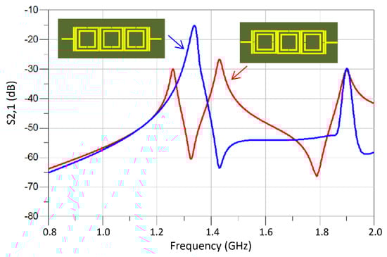 The dielectric properties of materials can be determined from the resonance technique [14,15,16,17,18,19,20,21,22,23,24]. This is possible because the resonance frequencies of a resonator are uniquely determined by its geometry, material properties (dielectric substrate on which the resonator is fabricated), and boundary conditions. If these parameters are known, it is then possible to extract the material properties such as permittivity of an unknown material or substance. This technique can be exploited only if the electromagnetic fields of the resonance structure protrude outside the resonator. This is the case of SRR based on microstrip technology. The resonance frequency and insertion-loss of the resonator are perturbed by placing the sample material on top of the resonator. The degree of parameter perturbation will be determined by the dielectric property of the sample material. The resonator can be calibrated with known materials and these data can be used to ascertain the material properties of the unknown sample material. The main advantage of using the proposed TC-SRR is that it magnifies the normal component of the electrical field, which makes it highly responsive to the dielectric part of the material under test (MUT). Consequently, the dielectric properties can be measured more accurately.