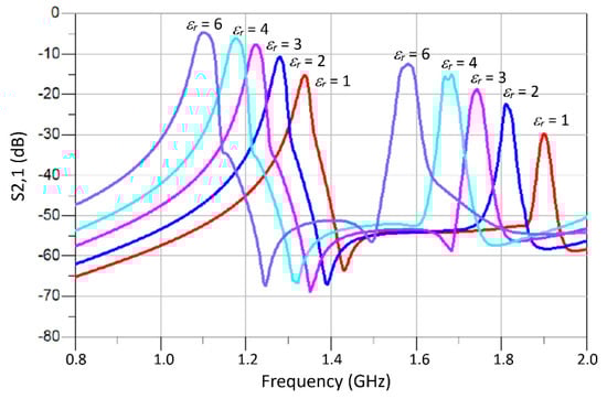 where and are, respectively, the resonant frequency and effective permittivity without MUT, and and are the resonant frequency and effective permittivity when a test material is placed on the sensor, respectively. Through an EM simulation, the resonant frequencies are extracted for different permittivities of MUT.