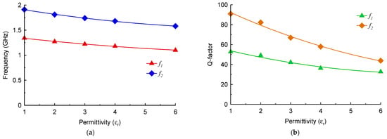 Sensitivity of the TC-SRR sensor. (a) Resonant frequencies as a function of permittivity, and (b) Q-factor as a function of permittivity.