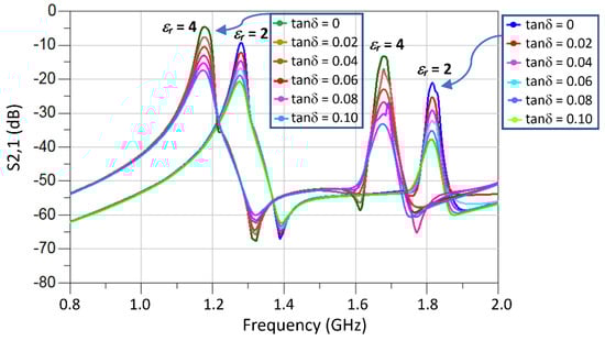 Insertion-loss response of the TC-SRR sensor for MUT samples of permittivities (εr) 2 and 4 of various loss tangents.