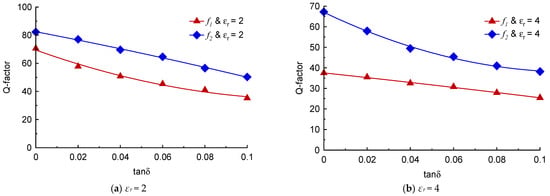 Q-factor versus loss tangent of TC-SRR sensor with MUT samples of permittivities (εr) 2 and 4.