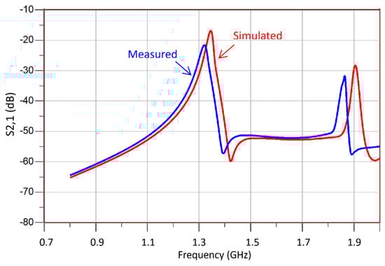 The TC-SRR sensor was fabricated on an FR-4 substrate having a permittivity of 4.4, thickness of 1.6 mm and loss-tangent of 0.014 using the dimensions given in Table 1. Figure 17 shows the TC-SRR sensor connected for measurement to a Rohde and Schwarz ZND Vector Network Analyzer (VNA). The measured and simulated transmission responses are shown in Figure 18. The agreement between the measured and simulated results is very good. The discrepancy in the results is attributed to the manufacturing tolerances resulting in an error of less than 2% in the case of the first resonance frequency.