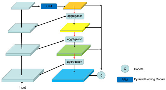 Double -feature pyramid aggregation module. We established the module architecture of the fast fusion module by incorporating an aggregation mechanism into a framework similar to an FPN [30]. The encoding part consists of a feature pyramid, and the decoding part is a lightweight FPN with an aggregation mechanism.