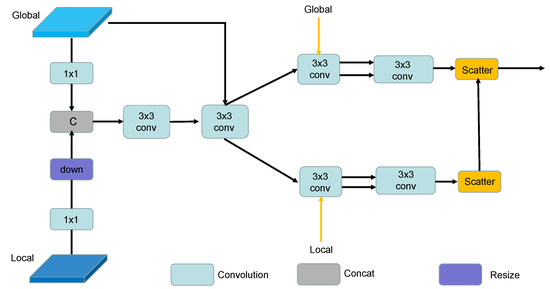 Figure 3 illustrates our aggregation pipeline. For better collaboration with the local branch, a 1 × 1 convolution was performed on the two branches, and the local feature map was downsampled to match the global branch’s feature map’s size so that the two could be merged in the channel dimension to produce an entire feature map that was the same size as the global branch’s. Then, a 3 × 3 convolution was performed on the complete feature map, and the result of the convolution was used as the new local part. Moreover, a 3 × 3 convolution was performed again on the global branch, and the result of the convolution was used as the new global part. Subsequently, two 3 × 3 convolutions were performed on the new global and local parts, and the scatter operation was performed on the corresponding results to generate the final feature map.