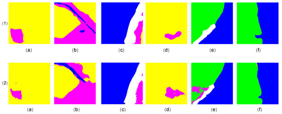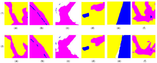 In Figure 4 and Figure 5, the segmentation results achieved by Fast-GLNet (line 1) and GLNet (line 2) are compared visually. It can be seen that there were many imprecise boundaries (Figure 4(2(a,d,f)) and broken parts (Figure 4(2(b,c,e)) in the segmentation results of GLNet. By optimizing the feature fusion mode of the global and local branches, Fast-GLNet successfully solved the problems of imprecise boundaries and fragmentation and improved the final quality of the segmentation results.