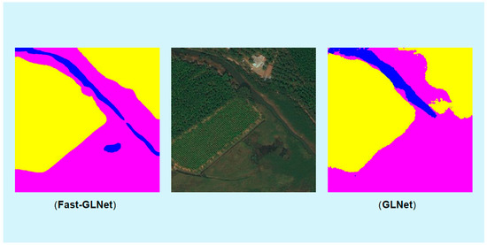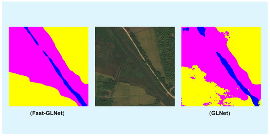 In order to more intuitively highlight the improvement of our segmentation accuracy, we visually display the segmentation results of remote sensing images of Fast-GLNet and GLNet. It can be seen that there were many broken and inaccurate parts in the segmentation results of GLNet, which made it difficult to determine the segmentation boundary accurately. However, our Fast-GLNet produced a more accurate segmentation situation, eliminated the broken parts in the segmentation process, had a more accurate boundary, and exhibited a better segmentation accuracy.