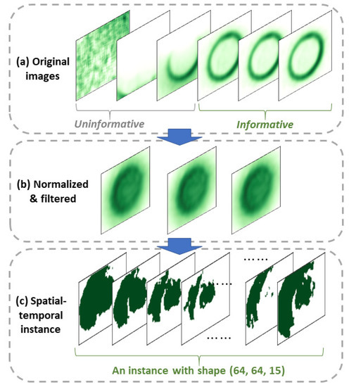 Lastly, to incorporate temporal dependency, image segments of 3 preserved frames with an increment of 5 inbetween were concatenated to form a spatial–temporal instance, which is 3-dimensional with the shape of (61, 81, 15). Per the convention of CNNs, we reshaped the images into (64, 64), so a spatial–temporal instance had a shape of (64, 64, 15) (Figure 4c). These became Input 1 to train the Di-CNN.