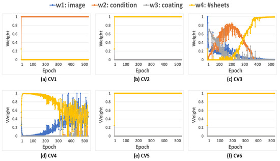 Figure 5 displays how the weight of each input evolved during the 500 training epochs in each iteration of the sixfold CV. As model training proceeded, the optimal weights were gradually revealed. When the Di-CNN model stabilized, the weights tended to stay at certain levels. Figure 5c,d show mild fluctuations, while the remaining subplots show stable weights upon training completion. Despite the randomness of the data split in CV, the nonzero weights were for the image (Figure 5b–f) and for the number of sheets (Figure 5c,d). Inputs 1 and 4 were the most relevant information sources for part quality prediction in this RSW application. Practically, the zero weights for Inputs 2 and 3 did not necessarily mean that these inputs were useless in part-quality prediction, but they were less relevant than Inputs 1 and 4. As an optimization problem, the adaptive weighting scheme finds the most relevant information sources for part-quality prediction, and may heavily weigh the best information source and shrink the rest. In the context of the Di-CNN, a zero weight for input means less or the least relevance, but “less or least” is in a relative rather than an absolute sense. Changing the information sources may alter the weight trajectory if the same input source becomes more relevant than other (new) input sources. Considering the randomness in CV, the training data used in each iteration may also impact the weights’ trajectories. For instance, Figure 5a shows that Input 2 was the most relevant to part quality, which is disparate from the results in Figure 5b–f.
