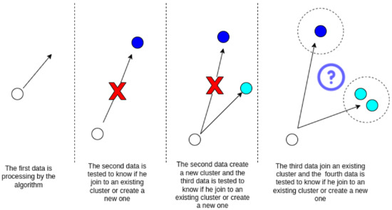Proposal clustering algorithm. No cluster exists when starting the algorithm, so one is created for the user who arrives on the network. Then, new users arrive and are grouped according to their features.