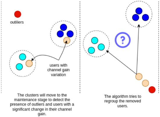 At each period , where is the current instant of time, maintenance of the existing clusters is performed as illustrated in Figure 3. The proposed algorithm is sensitive to outliers and changes in the user’s channel gain. Unlike the original DenStream, the proposed method does not discard the user when they have a significant channel gain change; they are removed from the cluster and reinserted into the system’s input queue. The same happens with users that are detected as outliers to confirm that that the outlier was not mislabeled.