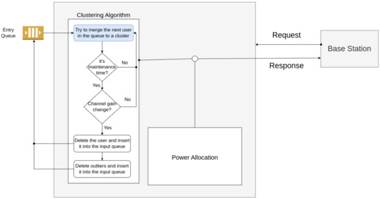 Initially, a network cell contains ten users served by a BS. Subsequently, new users join the cell, one at a time, totaling 12 users, a typical amount found in similar experiments in the literature and 3GPP [34]. In a period of T seconds, the cell’s input queue is checked to cluster new users and update who has experienced a significant change in channel gain. In this same period, a request for the final clusters is performed, the power coefficients are defined, and the throughput of each cluster is calculated as shown in Figure 6.