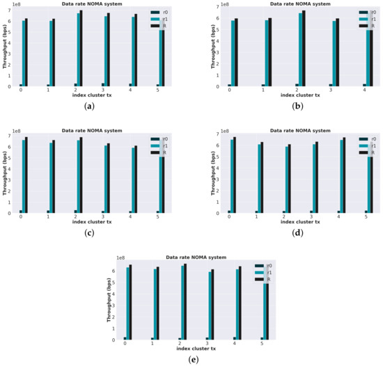Time behavior of the throughput of a downlink NOMA system after the channel gain variation. (a) Throughput after new users enter the cell. (b) Throughput after 125 s of users in the cell. (c) Throughput after 241 s of users in the cell. (d) Throughput after 354 s of users in the cell. (e) Throughput after 439 s of users in the cell.