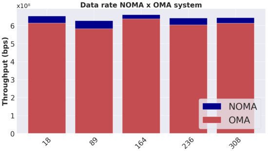 The slight variations over time that occur in Figure 7 are due to changes in the channel gain of each user. When users have more distant values of channel gains, the more significant the difference in the sum data rate is between a NOMA and OMA system and vice versa. The performance gains obtained in relation to the OMA in the analyzed time instants were equal to , , , and . These values are characteristic of the channel model used, as this model does not favor a large difference in channel gain between users.